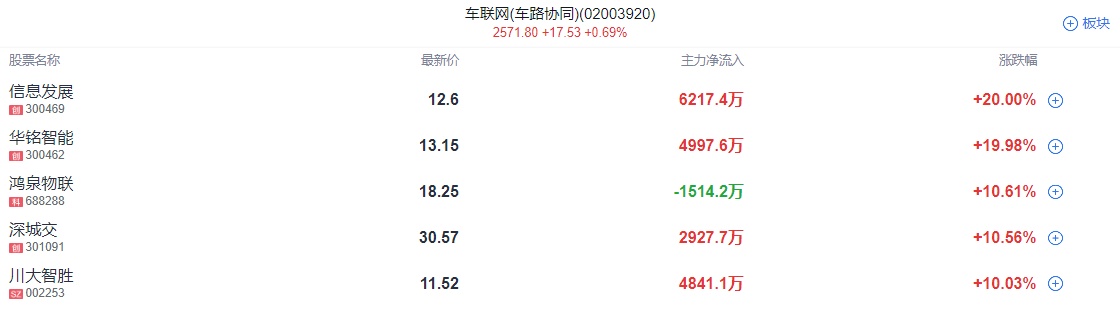 车路协同概念股延续强势,华铭智能、金溢科技等10余股纷纷涨停;智能交通、智慧城市等延伸概念跟随上行,立方控股、延华智能等多股封板。