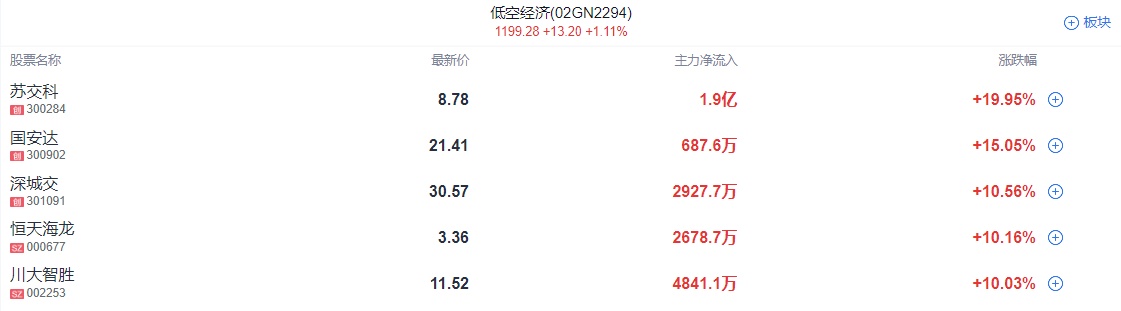 低空经济板块卷土重来,苏交科、深城交等多股涨停或涨超10%。