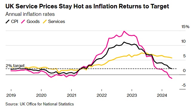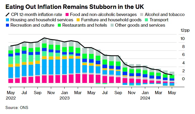 而对于英国央行来说,这些数据提醒人们,潜在物价面临的压力依然存在。在大选期间,外界预计英国央行周四不会调整利率。受到政策制定者密切关注的服务业通胀率仍高于预期,继4月上涨5.9%之后,5月上涨5.7%,经济学家预期为增速大幅下降至5.5%。
