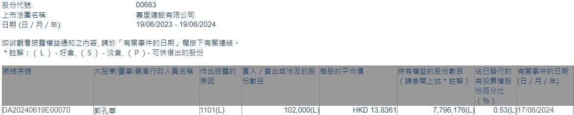 智通财经APP获悉,香港联交所最新资料显示,6月17日,执行董事兼主席郭孔华增持嘉里建设(00683)10.2万股,每股作价为13.8361港元,总金额约为141.13万港元。增持后最新持股数目约为779.62万股,持股比例为0.53%。