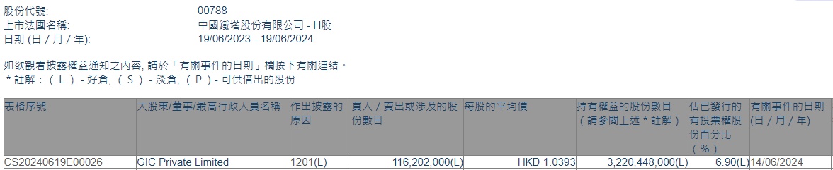 智通财经APP获悉,香港联交所最新资料显示,6月14日,GIC Private Limited减持中国铁塔(00788)约1.162亿股,每股作价1.0393港元,总金额约为1.21亿港元。减持后最新持股数目约为32.20亿股,最新持股比例为6.9%。