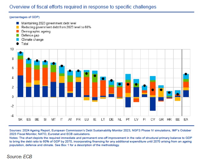 欧洲央行表示,应对这些具体挑战所需的预算努力可能至少占国内生产总值(GDP)的5%。“以历史标准衡量,必要的财政调整规模很大,但并非没有先例,”报告称。