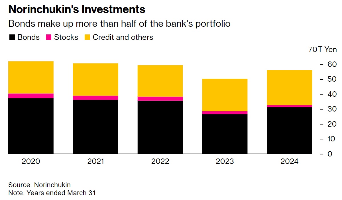 农林中央金库预计,随着债券出售,截至2025年3月财年的净亏损将升至1.5万亿日元,是2008年金融危机期间的近三倍(5700亿日元)。
