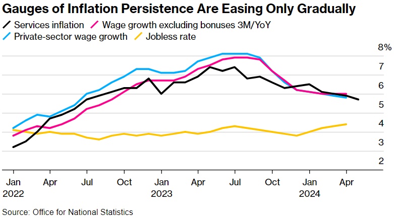虽然5月英国总体通胀率近三年来首次降至央行2%的目标,但政策制定者仍对服务业价格的强劲上涨持谨慎态度,该通胀并未像英国央行5月预测的那样迅速降温。