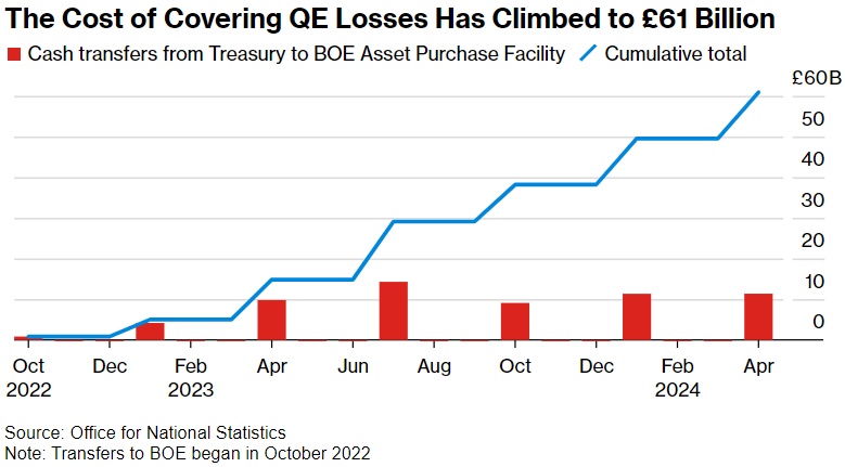 英国央行正在缩减其在10多年量化宽松政策下积累起来的政府债券资产负债表。目前央行正通过出售债券和到期债务,以每年大约1000亿英镑(1270亿美元)的速度花费英国财政部的一项赔偿,即政府弥补该计划的损失,这一举措被称为量化紧缩。