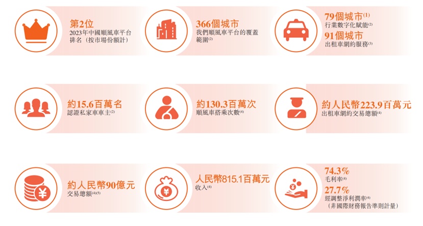 截至2023年12月31日,嘀嗒出租车网约车业务已覆盖全国91个城市,并与79个城市达成战略合作。截至最后实际可行日期,嘀嗒出行已与17个城市的地方交通运输部门及出租车协会展开全面的智慧出租车合作,并为73个城市中的916家出租车公司提供凤凰出租车云平台服务。
