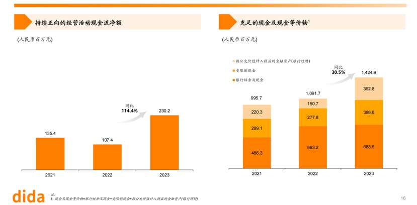 此外,2021年、2022年和2023年,嘀嗒出行的经营活动现金流净额分别为人民币1.4亿元、1.1亿元和2.3亿元,其中2023年同比增长114.4%。2022年是出行行业最严峻的一年,多个城市处于静态管理中。尽管如此,嘀嗒出行经受住了极度压力测试,于2022年仍然产生1.1亿元的经营现金流,充分说明了嘀嗒顺风车平台业务的韧性。2023年底,嘀嗒的现金及现金等价物达到14.2亿。