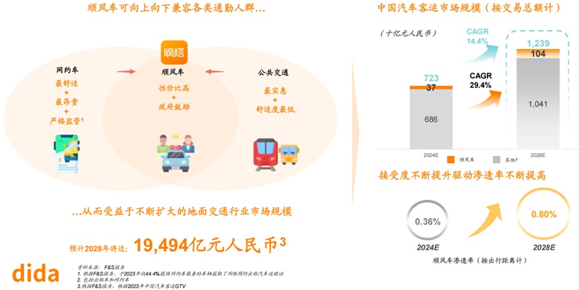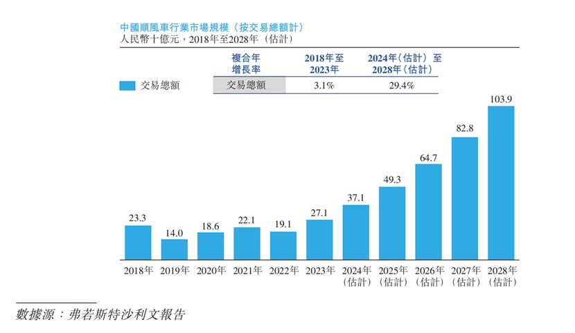 F&S报告预计,得益于宏观经济环境改善,城镇化率提升,私家车数量持续增长和更多顺风车利好政策推出,顺风车市场将成为中国汽车客运市场增长最快的细分市场,其交易总额预计将由2024年的人民币371亿元,增至2028年的1039亿元,2024-2028年的复合年增长率为29.4%。