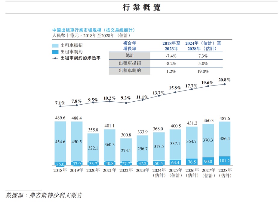 根据F&S报告,出租车依然在中国汽车客运市场占据最大市场份额,2023年占比约为54.2%,但出租车数字化较低,在2023年出租车交易总额中,扬招业务占比高达88.9%,目前,中国出租车数字化转型仍处于初期阶段,扬招模式在营运效率方面仍有很大提升空间。