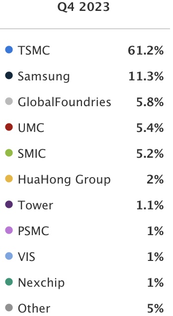 台积电目前的市场份额为61%,远高于其最重要的竞争对手三星电子(SSNLF.US) 11.3%的市场份额。另外两个最大的竞争对手是占有5.8%市场份额的格芯(GFS.US)和联电(UMC.US)。此外,台积电控制着大约90%的人工智能芯片制造。