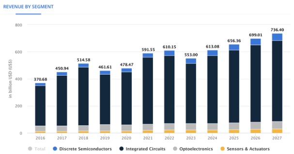 全球半导体市场预计到2023年将产生5530亿美元的收入,到2027年将产生73640亿美元的收入。这意味着在此期间市场将以6.30%的复合年增长率增长。
