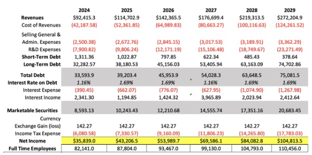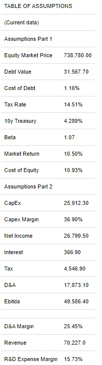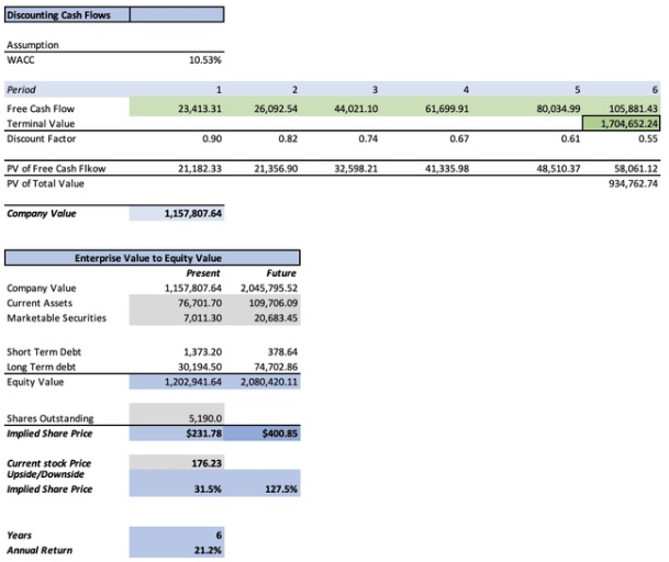 然后,假设流动资产将以7.420%的速度增长,这对应于2022-2024期间的平均年变化。所有其他因素,长期和短期债务和有价证券都在净收入预测部分计算。然后通过这些数字,计算潜在的未来权益价值,从而得出了未来的股票价格。