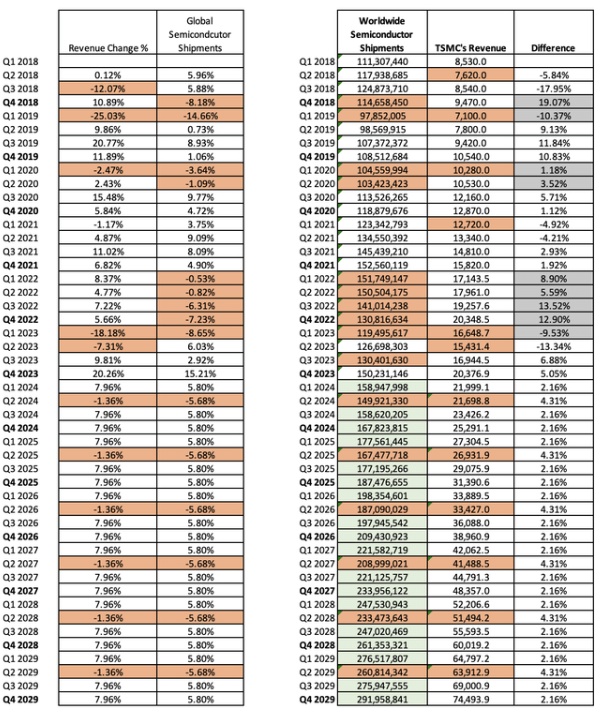 以DCF模型对台积电进行估值,通过财务指标可以得出加权平均资本成本(WACC)为10.53%,折旧与摊销(D&A)费用通过与收入挂钩的利润率来计算,该利润率为25.45%。值得注意的是,台积电收入变化主要是由全球半导体出货量的变化驱动的。根据数据分析,在全球半导体出货量增长期间,台积电营收增速较全球半导体芯片出货量增速高2.16%;在全球半导体出货量下降期间,前者比后者低4.31%。
