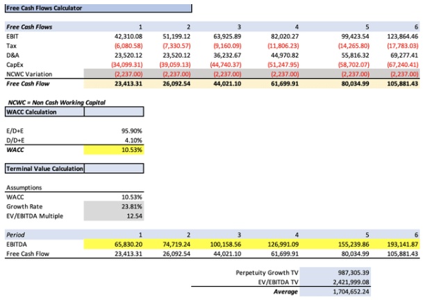 最后要获得的三样东西是资本支出、永续增长率。对于前者,分析师将假设它将在2021-2024年继续以7.420%的年增长率增长。然后,将3-5年的长期每股收益增长率(23.81%)除以该增长率与WACC(10.53%)之间的差值,计算出永续增长率。结果是1.792%。最后,2029年的潜在股价将通过获得未来企业价值来计算,综合以上数据,通过使用未贴现现金流来计算。