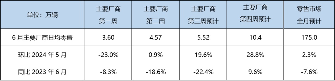 6月第一周包含了完整的端午假期,交车节奏相较去年同期略有后移,第一周日均零售3.60万辆,同比-8.3%,环比-23.0%。第二周日均零售4.57万,同比-18.6%,环比0.9%。第三周伴随“618”活动造势,各厂商营促销进一步发力,市场热度有所恢复,预计日均零售5.52万,同比-22.4%,环比19.6%。考虑到厂商冲击半年目标及二季度财报,预计第四周日均零售10.41万,同比增长9.6%,环比28.8%,综合估算6月零售可达到175万辆。