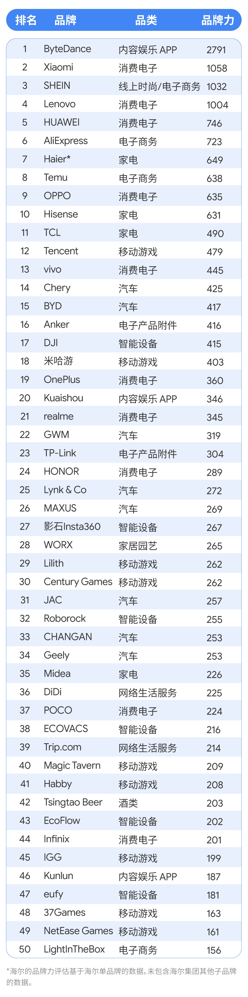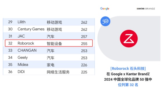 从榜单分析来看,中国品牌格局正在多个行业中迅速崛起,不再局限于传统领域,中国的品牌之林已然形成,各个行业的竞争格局都不再是一家独大,而是群雄逐鹿,各擅胜场。今年上榜的 50 强品牌来自于七大主要品类,品牌力占比最大的品类仍然是消费电子(25%),汽车行业是品牌力高速增长的行业,2024 年共有 8 个汽车品牌进入榜单,品牌力增长高达 51%;其中,智能设备行业的品牌力增长最为显著,达到了 61%。值得注意的是,石头科技(688169.SH)(Roborock)作为中国智能设备领域的创新品牌代表,排名第32位。
