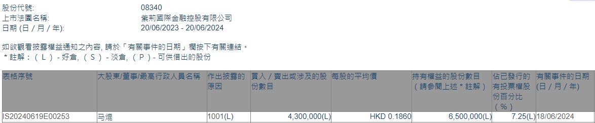 智通财经APP获悉,香港联交所最新资料显示,6月18日,马焜增持紫荆国际金融(08340)430万股,每股作价0.186港元,总金额为79.98万港元。增持后最新持股数目为650万股,持股比例为7.25%。