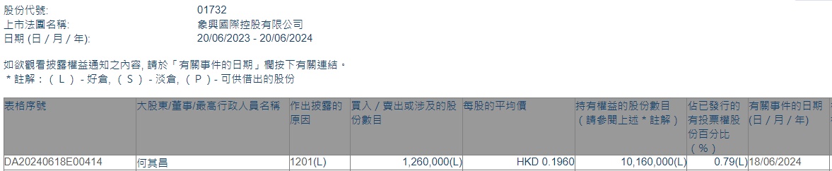 智通财经APP获悉,香港联交所最新资料显示,6月18日,独立非执行董事何其昌减持象兴国际(01732)126万股,每股作价0.196港元,总金额为24.696万港元。减持后最新持股数目为1016万股,持股比例为0.79%。