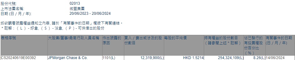 智通财经APP获悉,香港联交所最新资料显示,6月14日,摩根大通增持微盟集团(02013)1231.99万股,平均每股作价1.5214港元,总金额约为1874.35万港元。增持后最新持股数目约为2.54亿股,持股比例为8.26%。