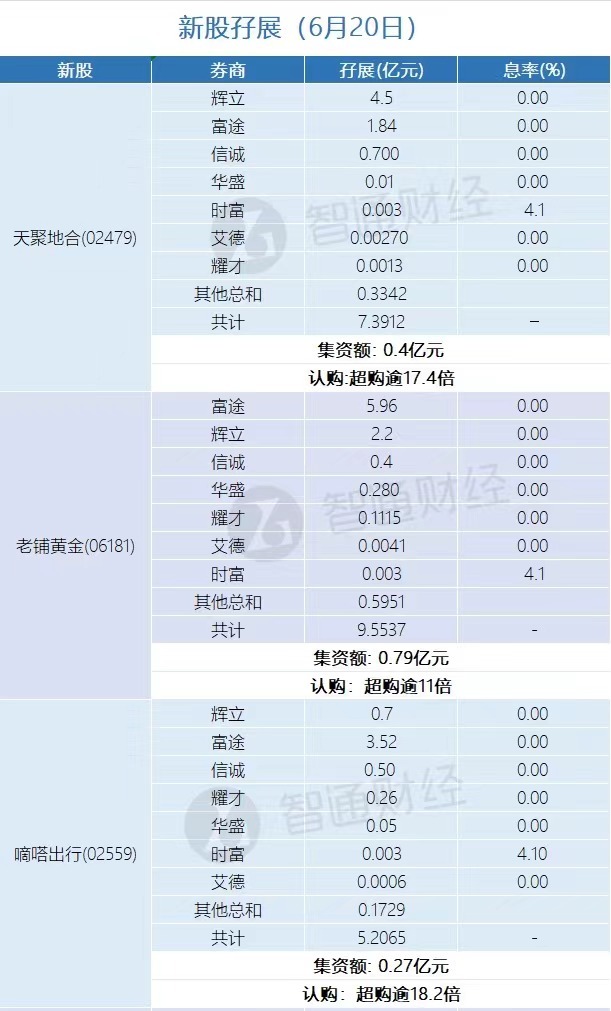 老铺黃金(06181)、嘀嗒出行(02559)正在招股中。截至6月20日,辉立、富途等券商合计分别为天聚地合计借出孖展7.3912亿港元,认购超购逾17.4倍;为老铺黃金借出孖展9.5537亿港元,认购超购逾11倍;为嘀嗒出行借出孖展5.2065亿港元,认购超购逾18.2倍。