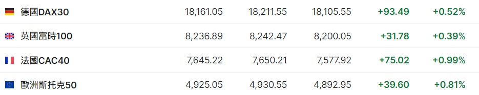 2. 截至发稿,德国DAX指数涨0.52%,英国富时100指数涨0.39%,法国CAC40指数涨0.99%,欧洲斯托克50指数涨0.81%。