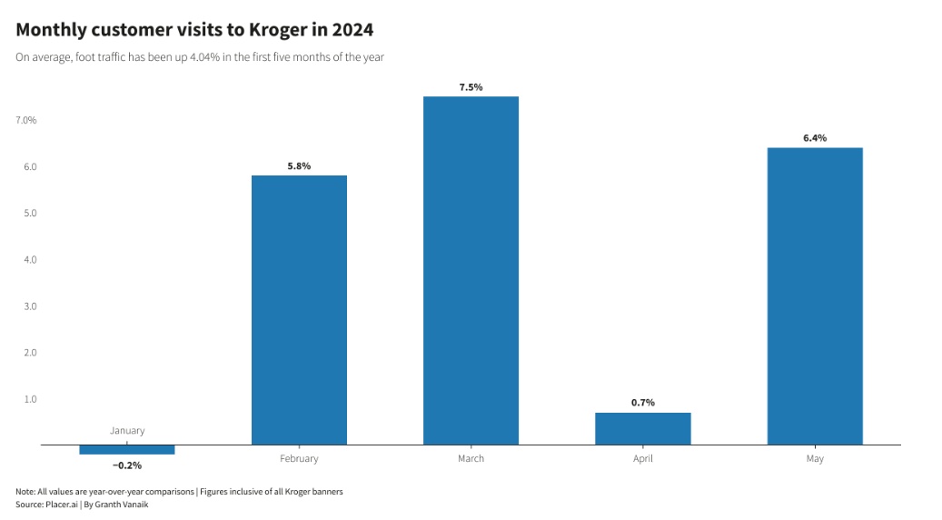 根据顾客位置以及客流量分析公司Placer.ai的最新数据,今年2月至5月期间,克罗格的客户访问量平均基准之下同比增长5.1%。