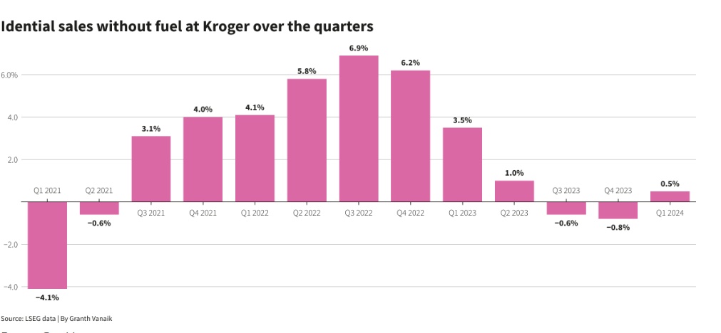财报数据显示,克罗格Q1总销售额为453亿美元,略高于分析师普遍预期,较上年同期同比小幅增长0.3%;Q1该连锁超市的同店销售额(不包括燃料项目)同比增长了0.5%,分析师普遍预期则为仅仅0.13%的增长幅度。