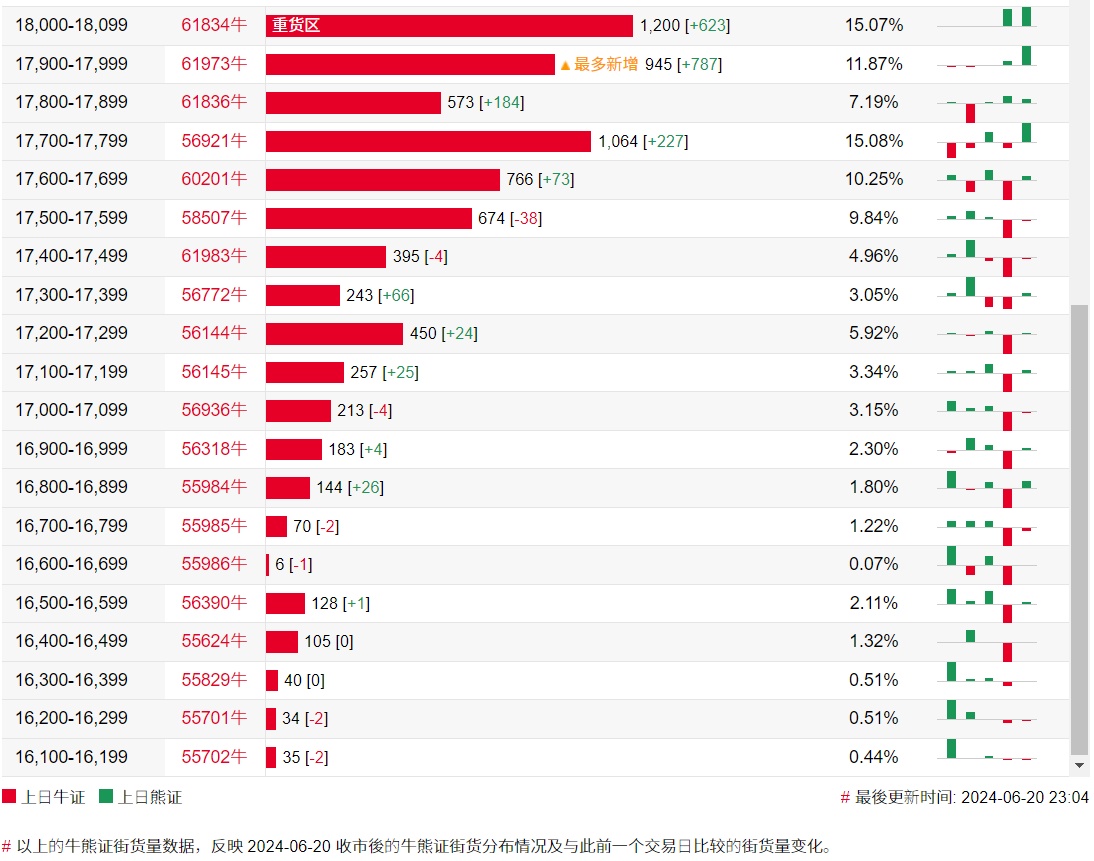 牛证街货重货区在18000-18099区间,该区间最新熊证数量为1200张,较上一交易日增加623张;最多新增在17900-17999区间,该区间最新牛证数量为945张,较上一交易日增加787张。