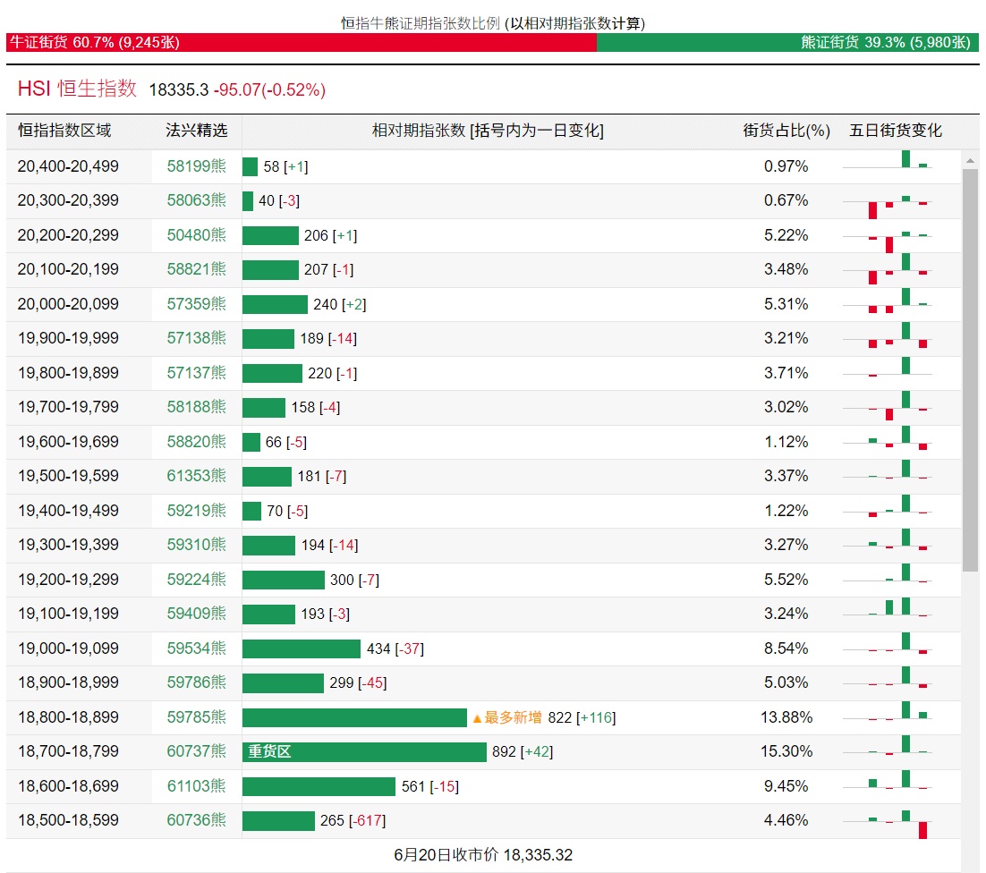 法兴恒指牛熊证街货分布图中的数据显示,熊证街货重货区在18700-18799区间,该区间最新熊证数量为892张,较上一交易增加42张;最多新增在18800-18899区间,该区间最新熊证数量为822张,较上一交易日增加116张。