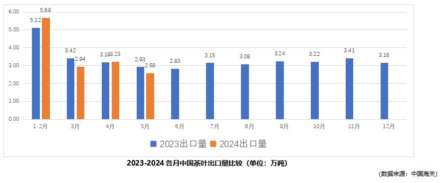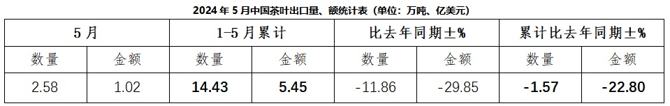 截至5月,2024年中国茶叶累计出口量为14.43万吨,同比减少1.57%,累计出口额为5.45亿美元,同比减少22.80%,1-5月出口均价为3.78美元/千克,比去年同期下降21.56%。