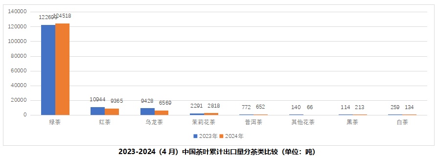 分茶类看。2024年1-5月,中国绿茶出口量为12.45万吨,占总出口量比重为86.3%,增加1825吨,增幅1.5%;红茶出口量为9365吨,占总出口量比重为6.5%,减少1578吨,降幅14.4%;乌龙茶出口量为6568吨,占总出口量比重为4.6%,减少2859吨,降幅30.3%;茉莉花茶出口量为2818吨,占总出口量比重为2.0%,增长527吨,增幅23%;普洱茶出口量为651吨,占总出口量比重为0.5%,减少120吨,降幅15.6%;其他花茶出口量为66吨,黑茶出口量为213吨,白茶出口量为134吨。