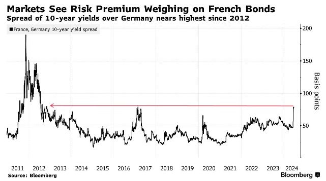 自本月早些时候法国总统马克龙解散议会要求提前投票以来,法国10年期政府债券收益率相对于德国10年期政府债券上涨了30多个基点,目前已稳定在略低于80个基点的水平——这是十多年前欧元区主权债务危机期间的水平。