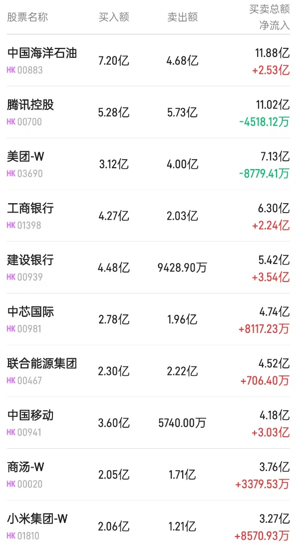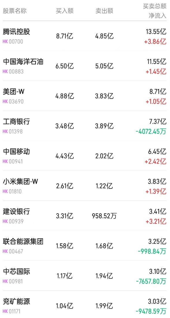 北水净买入最多的个股是建设银行(00939)、中国移动(00941)、中国海油(00883)。北水净卖出最多的个股是兖矿能源(01171)、联合能源集团(00467)。