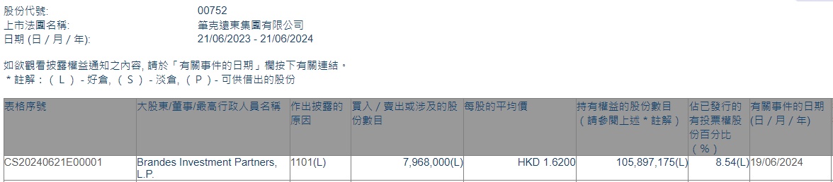 智通财经APP获悉,香港联交所最新资料显示,6月19日,Brandes Investment Partners, L.P.增持笔克远东(00752)796.8万股,每股作价1.62港元,总金额约为1290.82万港元。增持后最新持股数目约为1.06亿股,最新持股比例为8.54%。