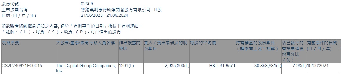 智通财经APP获悉,香港联交所最新资料显示,6月19日,美国资本集团减持药明康德(02359)298.58万股,每股作价为31.6571港元,总金额约为9452.18万港元。减持后最新持股数目约为3089.36万股,持股比例为7.98%。