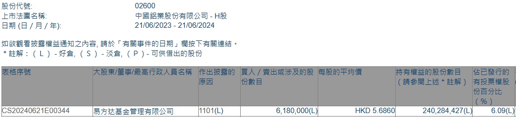 智通财经APP获悉,据香港联交所最新资料显示,6月19日,易方达基金管理有限公司增持中国铝业(02600)618万股,每股作价5.686港元,总金额约3513.948万港元。增持后最新持股数目约为2.4亿股,持股比例为6.09%。