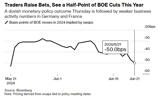 降息押注在英国也获得了支持,英国私营部门企业报告的增长速度低于预期。货币市场目前已经完全消化了英国央行今年两次降息25个基点的预期。周四,英国央行暗示即将首次降息。英国国债价格跳涨,对政策敏感的两年期国债收益率一度下跌6个基点,至4.10%。