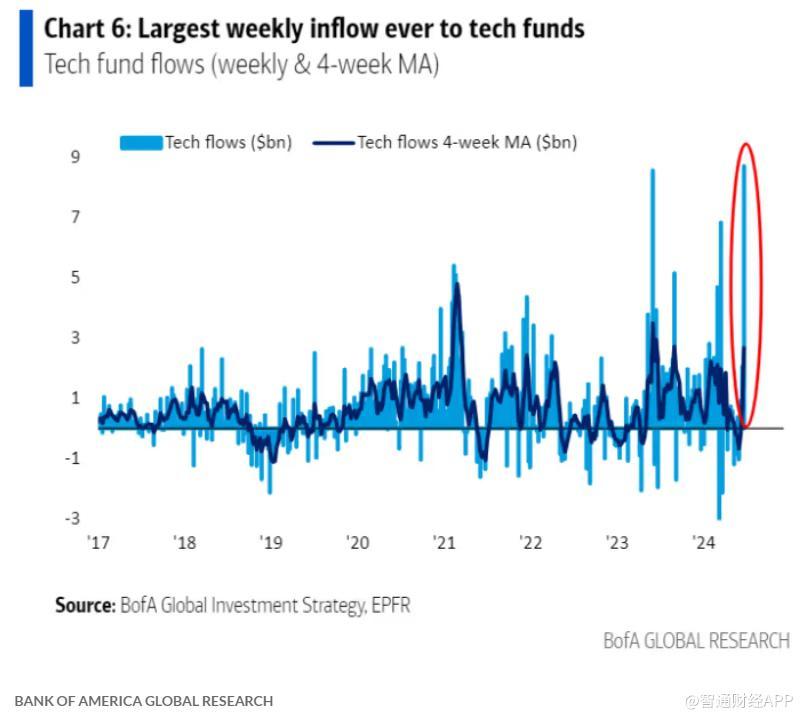 根据美国银行全球研究EPFR数据,截至周三结束的一周内,大约有87亿美元流入科技基金。投资者在过去几周持续加大对科技基金的投资,以追逐其上涨势头。
