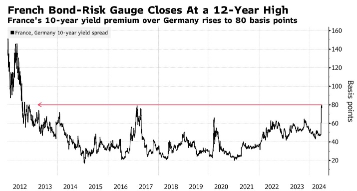 智通财经获悉,因投资者愈发担心在即将到来的立法选举中角逐胜利的政党可能进一步令公共财政膨胀,因此要求持有法国国债较基准的德国国债的风险溢价创下逾10年来最高水平。周五,两国10年期国债收益率之差上升3个基点,至80个基点,这是自2012年欧元区深陷债务危机以来的最大收盘利差。一些投资者表示,利差可能扩大至100个基点。