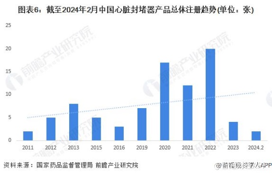 从细分产品获批情况看,我国先天性心脏病封堵器产品商业化程度较深,相关产品注册证数量较多,且先心病封堵器已实现国产替代。据前瞻产业研究院统计,截至2024年2月,国家药品监督管理局共颁发85张心脏封堵器产品注册证。