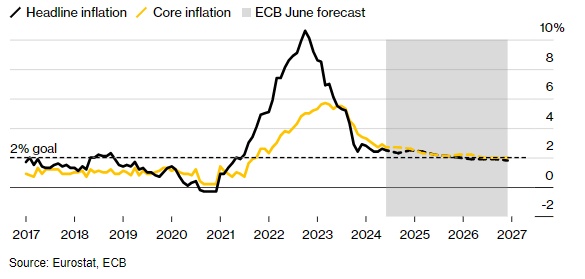 根据欧洲央行的最新预测,消费者价格增长预计将在2025年最后一个季度达到2%的目标。5月份的通胀率加速至2.6%,但彭博经济的Nowcast预测6月份的通胀率将降至2.2%。