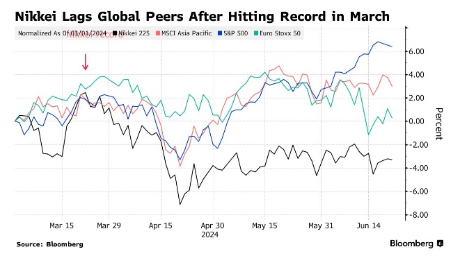 日本蓝筹股日经225指数自3月22日创下历史新高以来一直处于停滞状态。自那以后,该指数下跌了5.6%,而同期MSCI亚太指数上涨了1%,美国标普500指数上涨了4.4%。