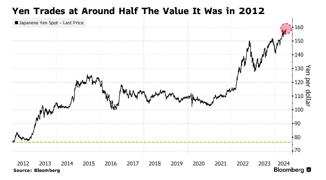 上周五,日元贬值至1美元兑160日元,这是自今年4月以来日元从未触及的水平,促使日本货币官员对过度的汇率波动发出警告。