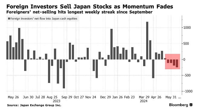 截至6月14日,外国投资者连续第四周成为净卖家。就在几个月前,外国投资者还帮助推动日本股市创下历史新高,击败了海外同行。东京证券交易所的数据显示,这是自去年9月以来最长连续卖出记录。