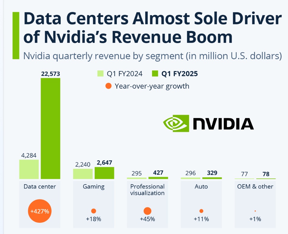英伟达2025财年Q1总营收规模同比增长262%至260亿美元,总营收一举创下历史新高,连续四个季度远超华尔街分析师普遍预期,并且总营收同比增速是英伟达连第三个季度同比增速超过200%。在H100/H200 GPU强劲的需求助力之下,英伟达Q1数据中心营收同比增长427%至226亿美元创历史新高。要知道,英伟达超过的上述这些季度普遍预期,乃华尔街分析师们在英伟达业绩公布之前经过不断上调后得出的营收预期。