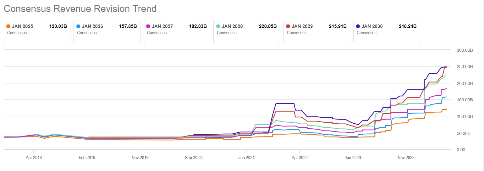 一年多以来,全球企业围绕人工智能技术无比狂热的布局浪潮引发了对英伟达AI GPU需求呈“爆炸式增长”,这也让华尔街分析师们不断上调的季度财务预测甚至成了笑柄。分析师们不是在“保守地”编造数据,他们像对待其他公司一样,从管理层以及英伟达核心客户群(比如亚马逊AWS、微软以及谷歌等)那里获得线索。