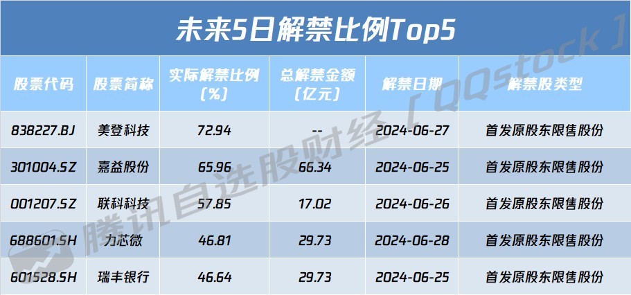 从解禁比例来看,未来5日美登科技实际解禁比例达72.94%,其次解禁比例居前的分别为嘉益股份、联科科技。