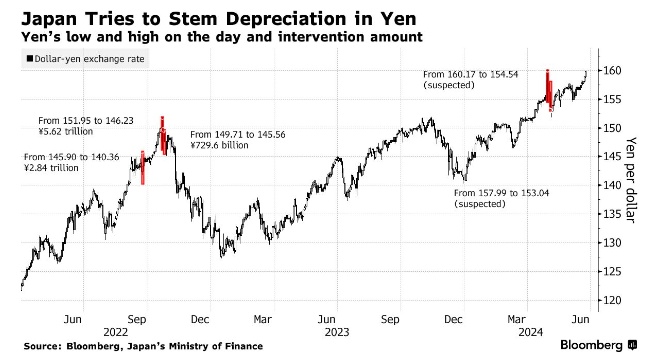 日本承认,在4月26日至5月29日的一个月时间里,它花费了9.8万亿日元(613亿美元)干预外汇市场。当局没有具体说明行动日期,但交易模式表明,4月29日和5月1日进行了两轮大规模干预。外汇储备数据显示,日本可能会出售美国国债,为此举提供资金。