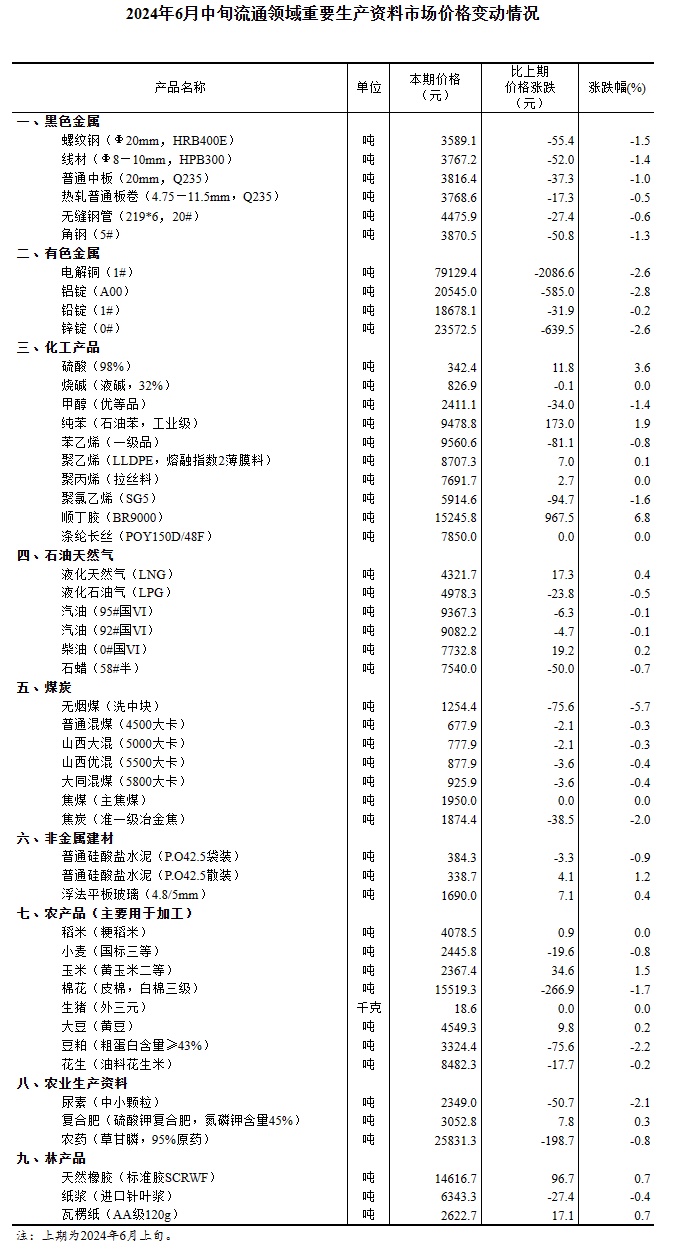 2024年6月中旬流通领域重要生产资料市场价格变动情况