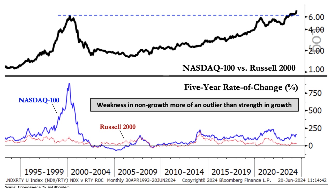 他表示:“我们可以把纳斯达克100指数和罗素2000指数看作这种关系的代表。虽然这一比率已经突破了2000年的峰值,但各个部分的五年变化率显示出现在和当时之间的显著差异。”